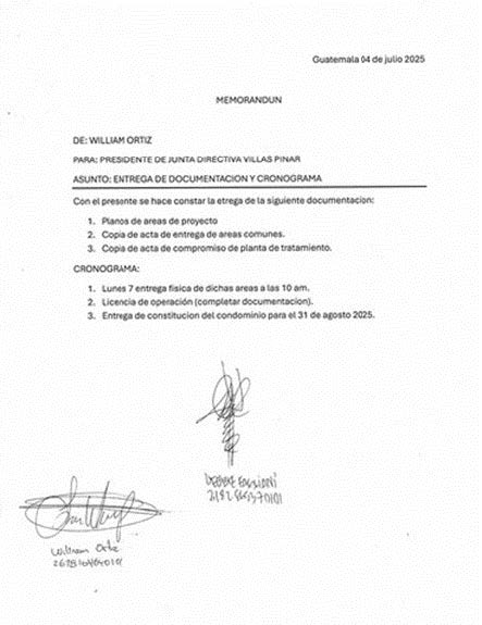Previo a la recepción de los planos del condominio, los miembros de la Junta Directiva suscribieron acuerdos que quedaron registrados y firmados de mutuo acuerdo en un Memorándum, el cual incluye un cronograma detallado con fechas para las entregas pendientes y posteriores, entre ellas: