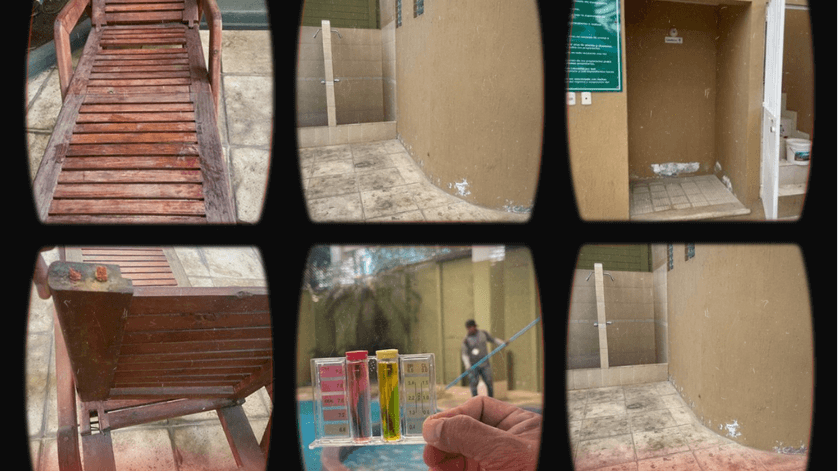 La piscina y jacuzzi, se constató que todas las áreas presentaban múltiples desperfectos y signos de deterioro: